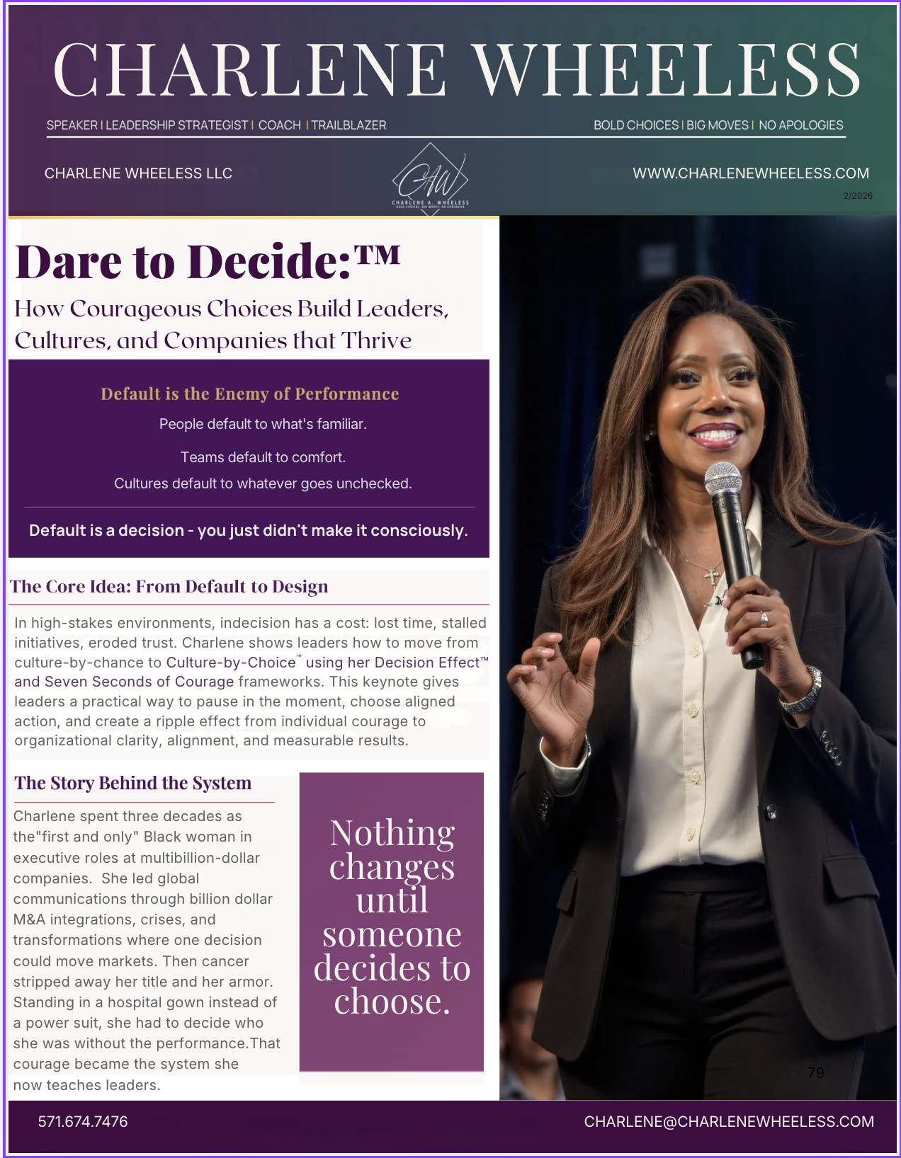 Most speakers talk about courage. I teach it as a system. The Decision Effect™ shows organizations how individual courage becomes cultural transformation—and how that transformation drives measurable performance. This isn't just motivational. It's operational."